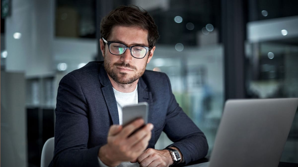 Geschäftsmann mit Smartphone: Ablenkungen bei der Arbeit mindern die Konzentration. (Quelle: Shape Charge)
